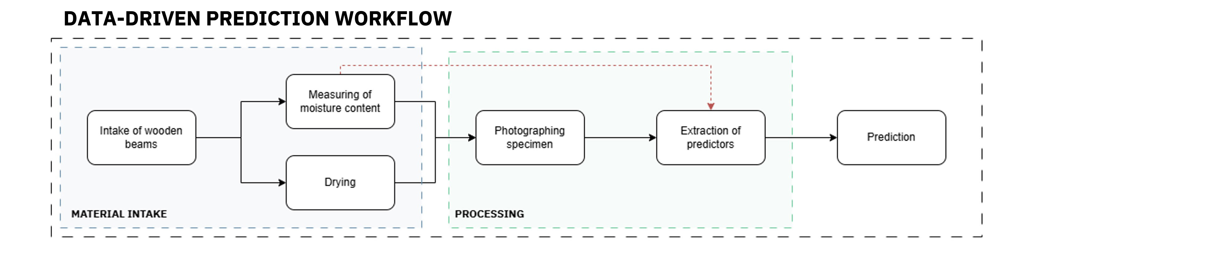 This research develops a data‑driven pipeline to non‑destructively predict the mechanical strength of timber beams using exclusively visual inspection metrics and imaging data. Beginning with a dataset of 323 Giant Fir specimens—filtered to 186 after cleaning and annotation preprocessing—the workflow extracts key features such as knot geometry, grain direction, and stress‑gradient metrics via YOLOv8 and Canny‑edge analysis. Beyond raw imagery, we engineer advanced vision‑based signals—including localized knot stress metrics, grain orientation vectors, and surface microtexture descriptors—to encode structural cues directly into the data pipeline. These engineered features enable more efficient learning and robust strength and elasticity predictions by distilling relevant physical information from high‑dimensional image data. Custom asymmetric loss functions were then formulated to embed European building‑code requirements—ensuring that at least 95 % of predictions do not overestimate actual strength—directly into model training. A suite of models was evaluated, from multilayer perceptrons and decision trees to convolutional and multimodal networks that jointly process numeric and image inputs. Feature engineering (knot stress, grain orientation) and leave‑one‑out plus SHAP analyses guided predictor selection, yielding an MLP variant with R² = 0.59 (bending strength) and 0.63 (modulus of elasticity), RMSE of 10 MPa, and MAE of 8 MPa. The final multimodal model achieved R² = 0.65 for strength prediction with an MAE of 6.9 MPa, translating to ~68 % exact‑class accuracy and ~96 % safe predictions—matching industry safety thresholds while substantially improving average error over existing standards. Student: Lucas Solberg Co-supervisors: Junaid Nabi, Roberto Naboni